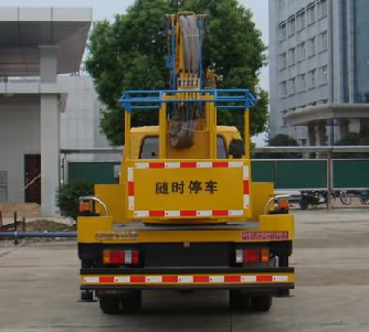 随底盘选装宽前保险杠;吊钩为选装件;选装平台防护栏外观;前伸725mm,后伸410mm;侧面防护及后下部防护装置材料材质:Q235,侧面防护装置连接方式:焊接;后下部防护装置连接方式:螺栓连接,断面尺寸(宽×高):30×180(mm),离地高度:470mm.